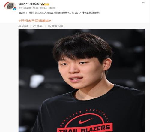 在被球队下放至NBA发展联盟1天后,11月3日,@波兰特开拓者 官宣:我们已经从发展联盟混音队召回了中锋杨瀚森。